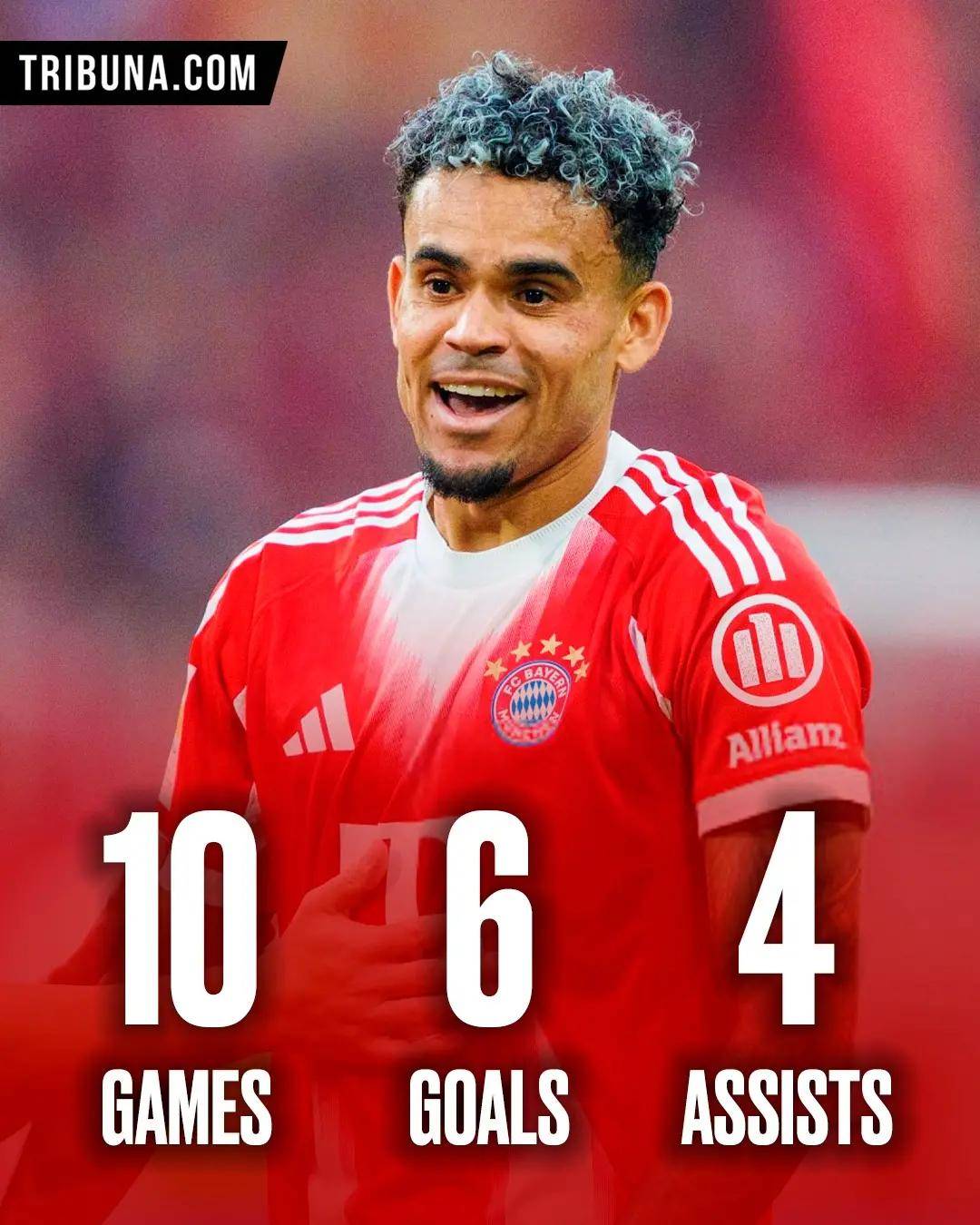 上赛季,凯恩和奥利塞携手帮助拜仁重新夺回德甲冠军。如今路易斯-迪亚斯的加入,让这家德甲豪门再次被视作有冲击“三冠王”的希望之队。不需要漫长的磨合期,迪亚斯就进入了场均制造1球的高效状态。在拜仁全线10场比赛的连胜中,他贡献6粒进球和4次助攻。他出色的盘带和灵活的跑位,让对手防不胜防,也在一定程度上减轻了凯恩与奥利塞的压力。如今的拜仁前场三叉刻画得十分犀利,攻势如虹,几乎让对手喘不过气来。